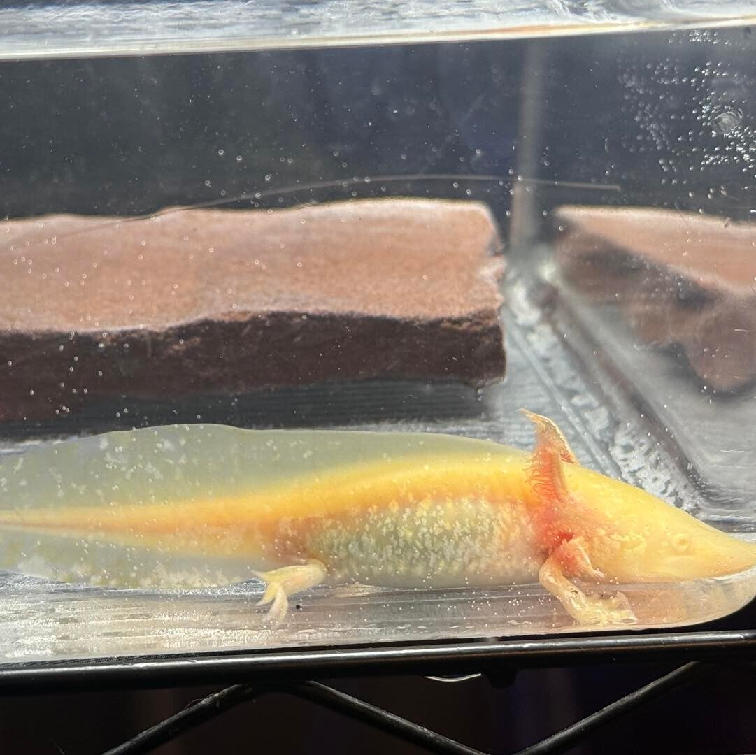 Golden albinos range from pale creamy yellow to vibrant orange.They will always have iridiphores (sparkles) in their eyes, on their gills and along their body.